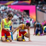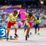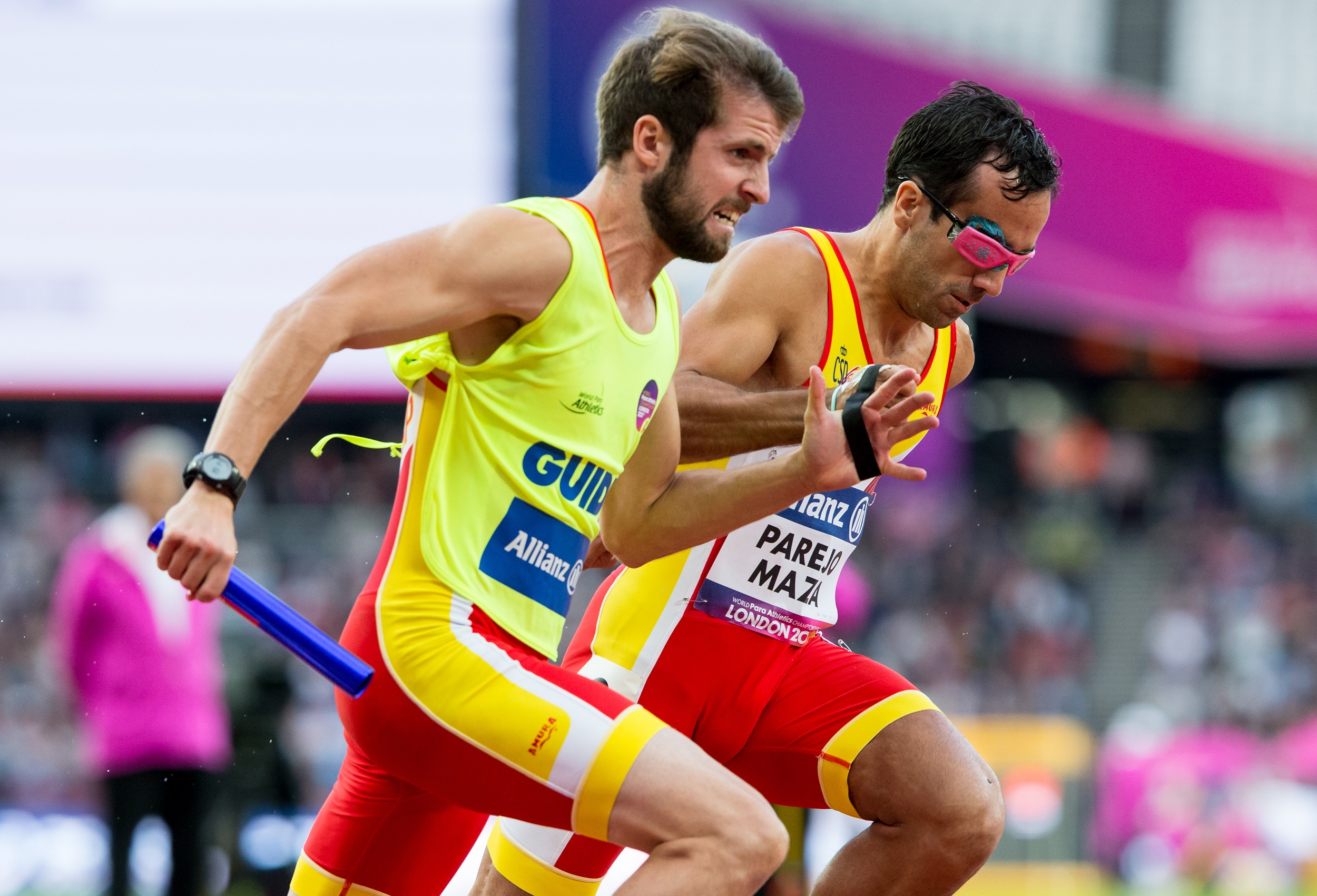Joan Munar y José Luis Fernández Taular, en la prueba del Relevo 4x100 T11-T13 Campeonato del Mundo de Atletismo Paralímpico Londres 2017.