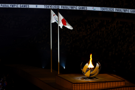 24-08-2021 Las banderas paralímpica y japonesa hizadas juto al pebetero en la ceremonia de apertura de los Juegos Paralímpicos Tokio 2020. © Jaime de Diego / CPE. Deporte Institucional Especial Tokio 2020 Jornada Ceremonia de apertura