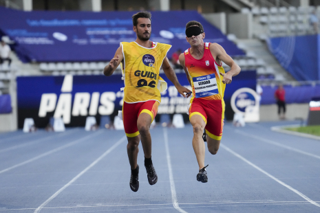 14-07-2023 Gerard Descarrega-José María Marvizón en las semifinales de 100 metros T11 durante el Campeonato del Mundo de Atletismo Paralímpico de París. Deporte Atletismo